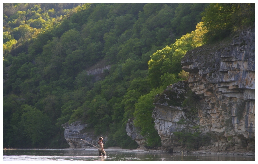 Sur un post au dessus de Souillac au petit matin.. un pêcheur à la grande canne tape les courants..